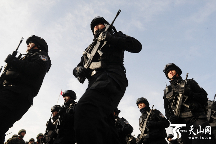 参加誓师大会的公安特警向任务区进发。(新疆日报记者卢民一 邹懿摄)
