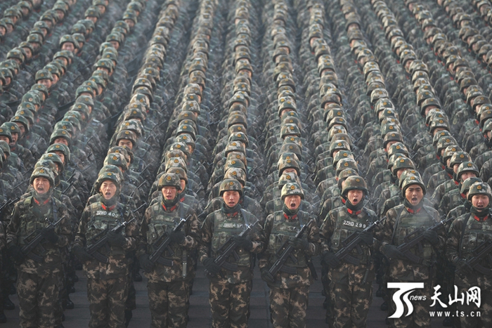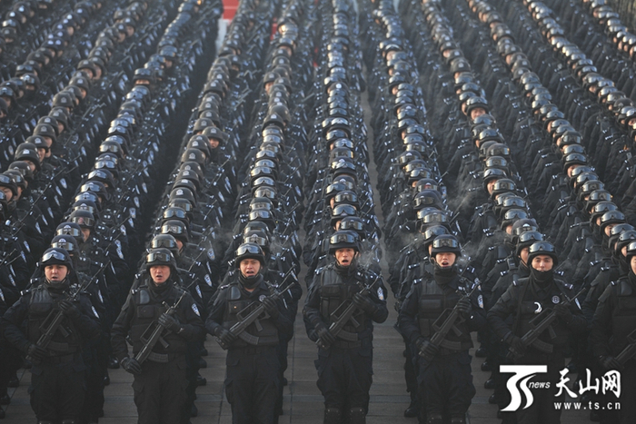 冬日早上的广场本该人少寂静,然而万名武警官兵、公安干警,以及数百辆各类警车、战车早已集结于此。只见迷彩、灰蓝、黑色方阵交错排列,其后的白色、绿色、黑色战车、警车呈雁阵停放。远远看去,整支队伍就像鲲鹏展翅,威武而雄俊。这是一支由多方力量组成的反恐维稳队伍,正在庄严等待新疆维吾尔自治区“扬威震慑 武装拉动”反恐维稳誓师大会的举行。
