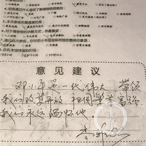 尽管该问卷的主要内容是调查游客对陈列馆的印象和服务评价,但不少游客在“意见建议”一栏“答非所问”——“邓爷爷是我心中的偶像”;“看了邓小平 同志的生平事迹,觉得自己还需努力,成为国之栋梁,家之支柱”;“邓小平爷爷让我们富起来了,很感谢他”;“邓小平是一代伟人,带领我们改革开放,祖国繁 荣富强,我们永远怀缅他”……