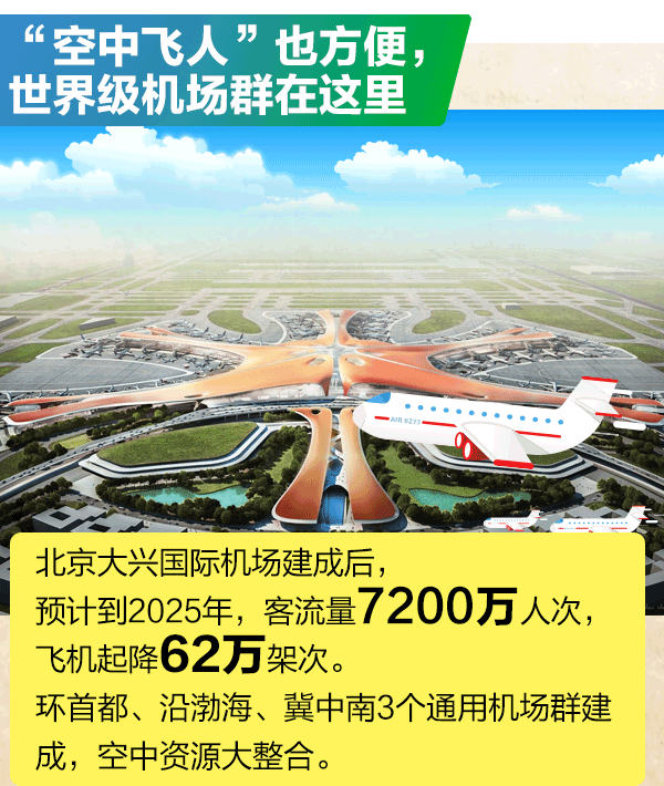 北京新机场主航站楼主体结构封顶,飞行区工程全面开工;河北机场集团公司纳入首都机场集团公司管理,天津滨海国际机场、石家庄机场航线网络进一步完善,北戴河机场投入运营,承德机场加快建设。。。。。。。世界级机场群一旦建成,从京津冀出发就有了更多的选择,堵在去机场路上的难题也将得到缓解。