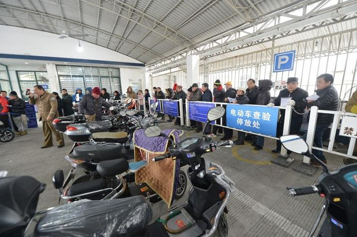 普陀区礼泉路上的非机动车上牌点,等候验车申领号牌的市民排起了队。