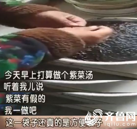 “给他们照照这个牌子,都别上当了,佳乐家上的,都是方便袋子的,全是方便袋子绞碎了,不是我儿子说,我也不知道,纯粹的方便袋子。”视频中,一个操着潍坊口音的大妈,从看起来像是泡好的紫菜里面捞出来一条,小心的展开。紫菜立马变成了一条半透明的薄膜。大妈立即断定,这一盆紫菜,那是用绞碎的塑料袋制成的。