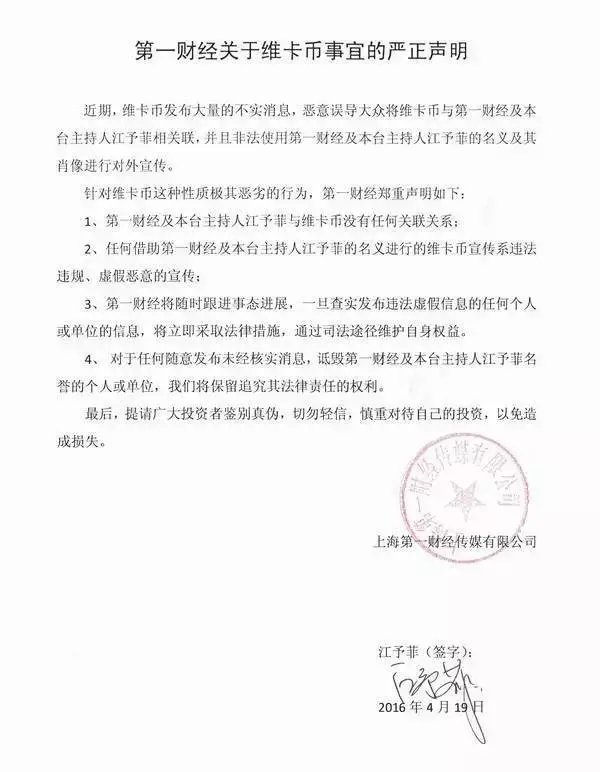 此外,2016年4月,第一财经发布《第一财经关于维卡币事宜的严正声明》称:近期,维卡币发布大量的不实消息,恶意误导大众将维卡币与第一财经及本台主持人江予菲相关联,并且非法使用第一财经及本台主持人江予菲的名义及其肖像进行对外宣传。