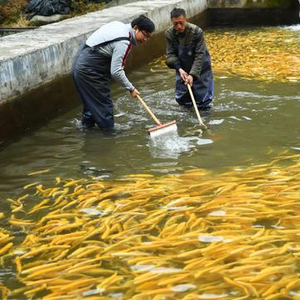 井冈山长坪乡长坪村,钟万银(右)跟着从广州返乡创业的李爱平一起在冷水鱼养殖基地里忙碌(2016年12月18日摄)。新华社记者 周密 摄
