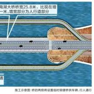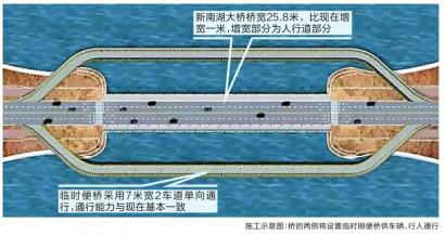 关于这一点,市民可以放心,为保持原有通行能力,整个南湖大桥翻建施工期间,会有临时便桥供交通使用,在翻建施工前,相关部门将会在现在桥梁南北两侧各设置一座临时钢便桥,临时便桥采用7米宽2车道单向通行,与现有南湖大桥通行能力基本一致,可以保证车辆及行人出行顺畅,也可以避免造成周边路网的拥堵。