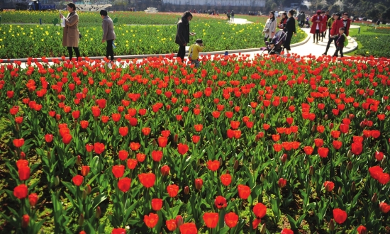 记者现场看到,名花广场上的郁金香已开始绽放,不少游客在观赏郁金香。省森林植物园工程师黄秀介绍,今年从荷兰引进上百个品种,以“盛世花开”作为花展主题,2万余平方米的郁金香汇聚在名花广场,花中有花、美不胜收。此次花展还将展出“香奈儿”、“黑土地”、“夜王后”等46个特色新品种。