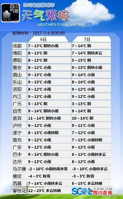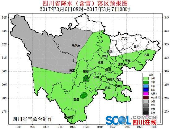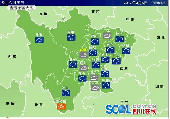 3月7日白天到晚上:盆地西南部、南部阴天有小雨,盆地其余地方小雨转多云间阴;甘孜州东部、北部、阿坝州北部及凉山州大部阴天有阵雪(雨),川西高原及攀西地区的其余地方多云。