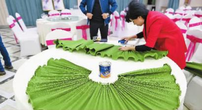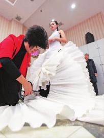 3.杨丝丝娴熟地用剪刀修剪“婚纱”
