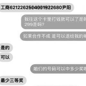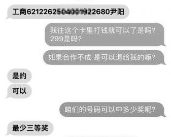 记者换了手机号码再次联系该男子,最后答应对方缴费注册会员,之后男子发来短信,上面写着汇款的银行卡号和姓名。短信里,该男子告知记者如果合作不成是可以退还全部费用的,并且承诺最少可以中三等奖。