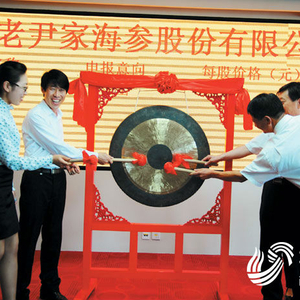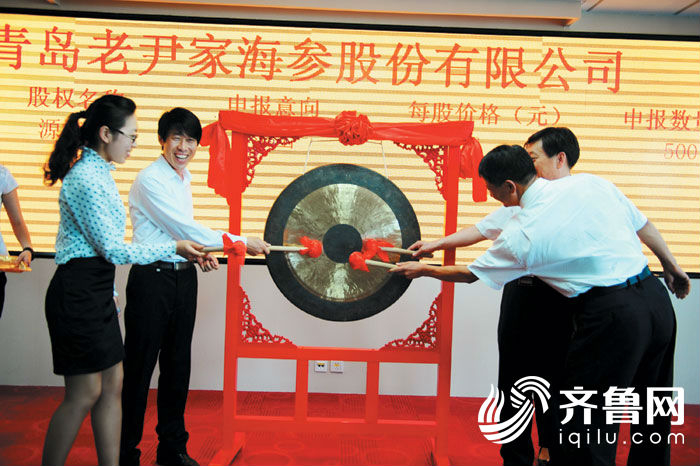 金改三年来, 山东地方金融活力明显增强, 图为 2014年 6月 6日, 一家水产业龙头企业在青岛 蓝海股权交易中心正式挂牌, 成为青岛海参 “第一股” 。