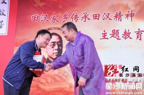仪式上,田汉长孙、田汉基金会理事长田钢专程前来,向全县农家书屋、中小学捐赠叙述田汉生平事迹的图书。志愿者代表宣读《关于号召长沙县各界青年传承田汉精神的倡议书》,倡导青年朋友学习和传承田汉紧跟时代、追求真理、献身革命的理想信念。