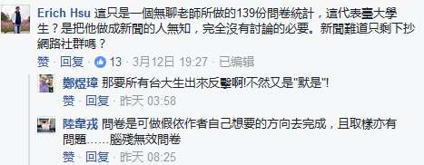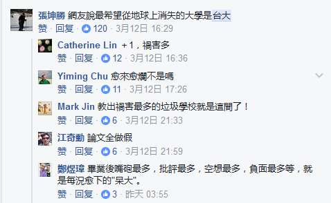 对于台大课堂上这项给予“绿委”充分“发挥空间”的票选题目,众多台湾网友却并不买账。不少网友都在社交网站“脸谱”(Facebook)上留言,将矛头纷纷对准台大。有网友酸讽,谁可以举办一个“最该在地球上消失的大学测验吗?”有人更直言,“不意外,台北帝国大学(台大旧称)”,“让台大也从地球上消失吧”,还有网友感叹,“怕以后只有大陆的国歌可以听了,无法理解“台独”对台湾人民有什么好处?“