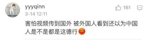 但如此“幽默”的表达显然仍无法令多数受众接受,一个名为“yyyqinn”就表示,“害怕视频传到国外,被外国人看到还以为中国人是不是都是这样的。”