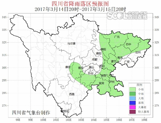 省气候中心发布的预报数据显示,预计2017年春季(3~4月)我省气温以偏高为主,降水量以偏少为主。全省大部气温较常年均值偏高0.5~1.0℃;川西高原北部、盆地东北部、盆地中部降水量较常年均值偏多1~2成,省内其余地区较常年均值偏少1~2成。