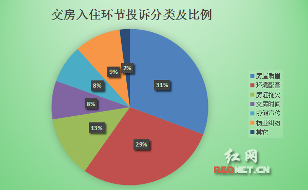 2016年红网消费维权房产版共收到网友在交房入住环节产生的投诉189次,投诉的原因为房屋质量、环境配套、房证拖欠、物业纠纷等。