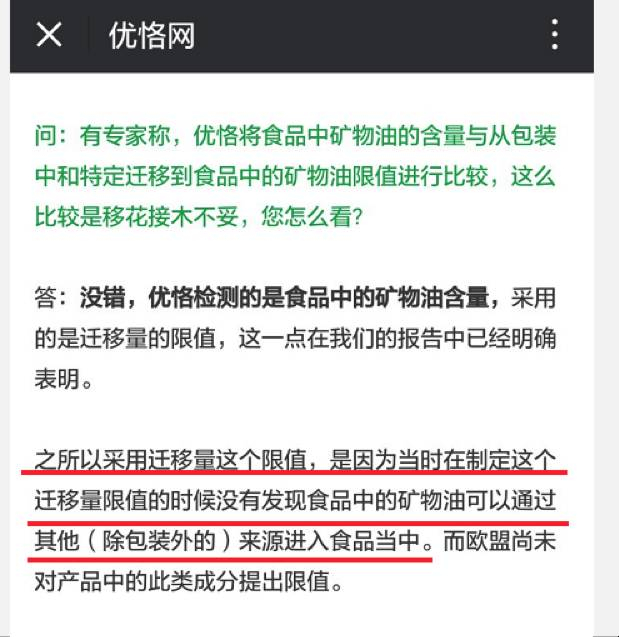 比如,对于用食品外包装上的矿物油[迁移量]“移花接木”食品矿物油总[含量]的质疑,“优恪网”就宣称: