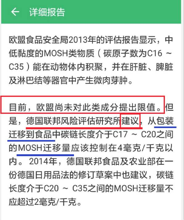 更重要的是,这些个德国非官方的建议,针对的也根本不是食品中矿物油的[含量],而是矿物油从包装“迁移”到食品中的[迁移量],两者根本不是一个概念。