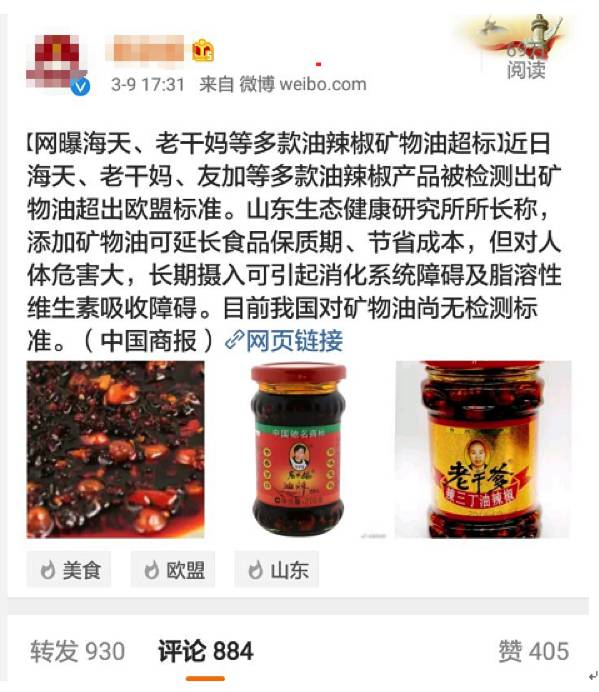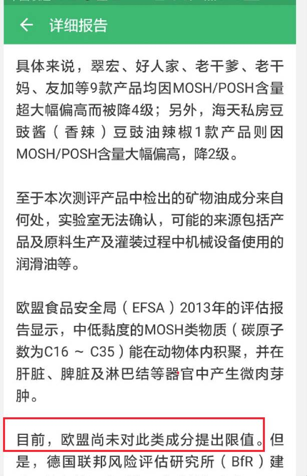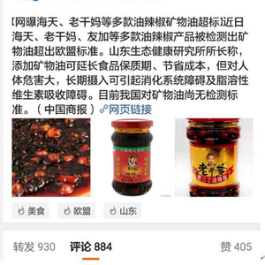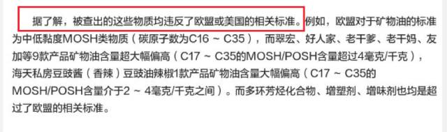 而且,上面这张图中那句“目前我国对矿物油尚无检测标准”恐怕更会让大家气得骂政府:为啥人家欧盟就能检测出老干妈的问题,我们中国却根本不管,要毒害自己的老百姓?!