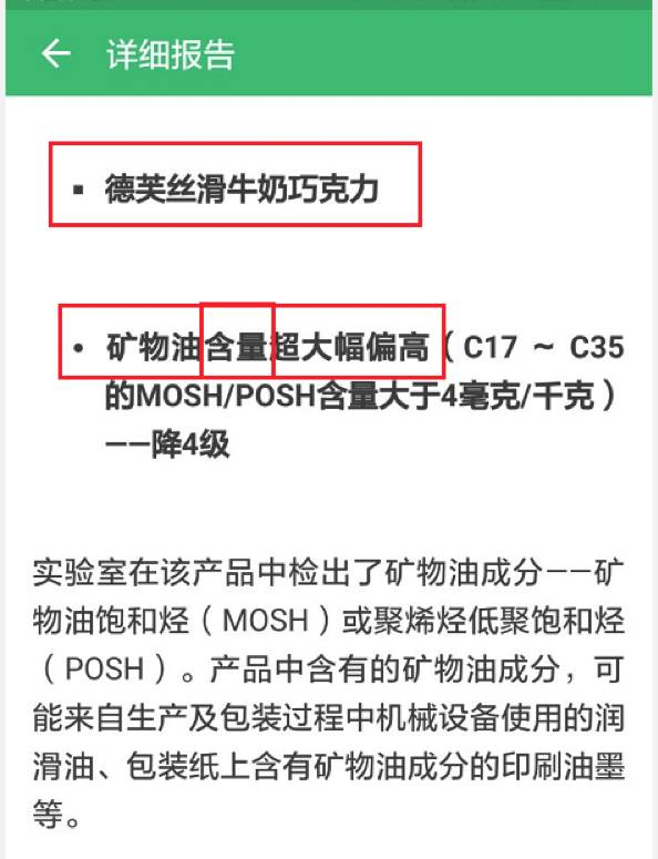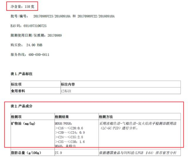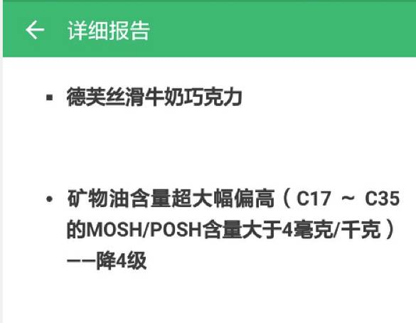 1、“高粘度”和“第一级”中低粘度这两个区间的矿物油检出总量为2.8+1.6=4.3mg/kg,即在150g的德芙巧克力中,其含量则约等于0.645mg。