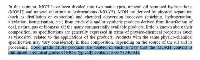 这两者的区别在于,工业级的矿物油含有一种叫做MOAH的成分,对人体可能有致癌效果;但食品级的则通过精炼的手段基本上消除了MOAH,只剩下另一种名为MOSH的成分。