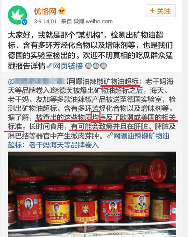 然而,“优恪网”却在几天后“故伎重演”,在他们发布的一期关于“老干妈”油辣椒等产品的检测报告中,再次宣称老干妈的矿物油含量“超标”。