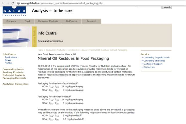 一个典型的案例是,“优恪网”不断提及的那个德国农业部2mg/kg的标准草案,其实针对的是用来包装非油脂类干燥食品的可回收硬纸板,而不是食品中矿物油的总含量。而且这可能也是因为那些可回收硬纸板里可能含有工业级矿物油所含有的MOAH成分。所以按照MOSH与MOAH4:1的比例,才有了这个2mg/kg的建议。