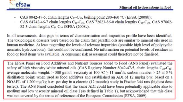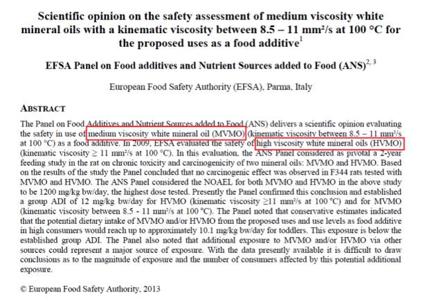 European Food Safety Authority, SCIENTIFIC OPINION Scientific opinion on the safety assessment of medium viscosity white mineral oils with a kinematic viscosity between 8.5 – 11 mm²/s at 100 °C for the proposed uses as a food additive1 EFSA Panel on Food additives and Nutrient Sources added to Food (ANS)2, 3, EFSA Journal 2013;11(1):3073, 2013
