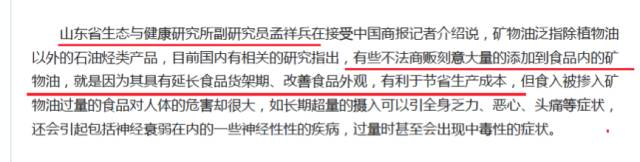然而,除了炮制了一个不存在的“欧盟标准”,《中国商报》的记者没有经过详细调查,还拿出了一个所谓的专家的说法,诱导大众去以为“老干妈”涉嫌故意在辣椒油里添加矿物油,是违法行为…