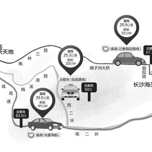 对此,潇湘晨报记者进行了体验调查:三名记者选定同一行程,从步步高梅溪新天地到长沙海关,同时段分乘两辆滴滴快车和出租车。一辆网约快车严格按滴滴内置导航线路行驶,一辆按记者指定最近线路,出租车司机则自行选择第三条线路。