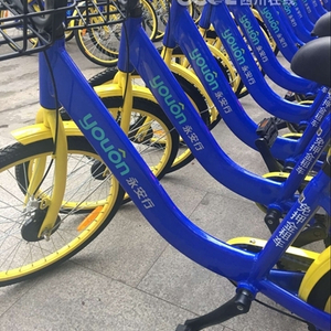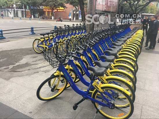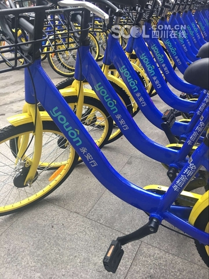 四川在线消息(记者 李霞 伍力) 17日上午,南充市涪江路新华书店门口,数十辆黄蓝相间的自行车整齐排放,吸引不少来往市民注意。自行车上印有“免押金租车”“1元起”“扫码租车”“永安行”等字样,自行车座椅下方还有二维码。