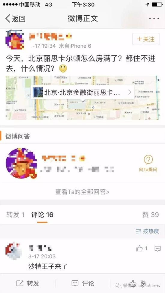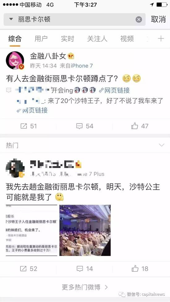 吸引大量围观的豪华出访团,也带火了一家豪华五星级酒店——金融街丽思卡尔顿。为了一睹传说中集颜值和财富于一身(不一定个个都是)的沙特王子们,有心的网友们甚至扒出了王子们的下榻酒店,恨不能在丽思卡尔顿和王子们来个偶遇。