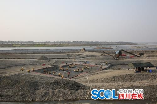 3月20日,考古发掘现场向媒体开放。截断的岷江河谷,被江水冲刷成一条条红褐色沟槽的河床已裸露在外。刘志岩透露,河床距离地面大约两三米,张献忠时代散落的文物,就集中沉在河床里。