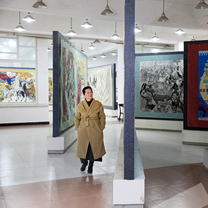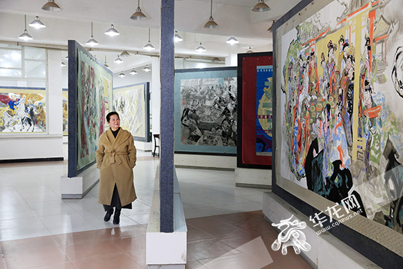 从南岸区六公里驱车约半小时,便抵达了江碧波位于巴南区狮子山的工作室。工作室一楼两侧的大厅里,陈列着装裱了的、每幅高2米多的画作。这些国画都是《上下五千年》的部分。