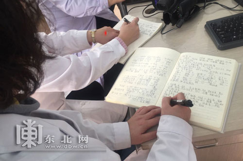 随同张琪一起出诊的学生们认真做抄方笔记。东北网记者 杜筱 摄