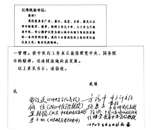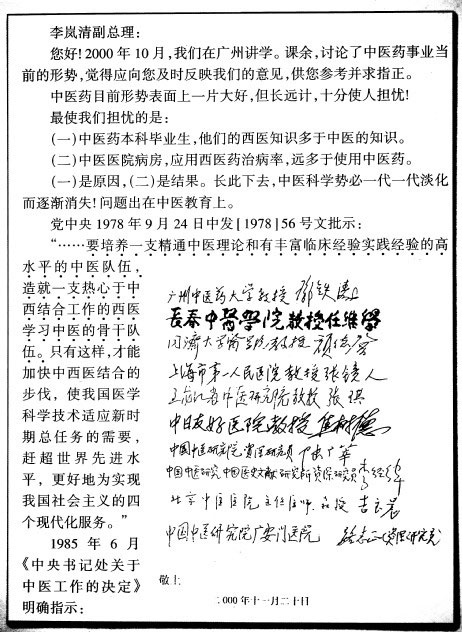 2000年11月,张琪与广州中医药大学邓铁涛教授等九位名老中医就中医药教育问题致信李岚清副总理。
