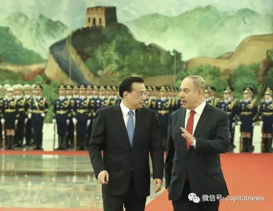 20日下午,李克强总理在人民大会堂热情欢迎了内塔尼亚胡,这是全国两会后,李克强接待的首位外国政府首脑。会谈后,两国总理共同见证了中以经济、科技、商务、民航等领域多份双边合作文件的签署。