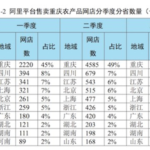 数据显示,2016 年知名平台售卖重庆农产品网店数量稳中有进。2016年12月底,在阿里平台销售重庆农产品的网店有9755家,比2015年12月的4576家增长了113%。但值得注意的是,其中仅有47%是本地网店,四川、江苏、北京、上海、广东、浙江、湖北、山东、湖南等外省市网店占据了53%,其中四川、江苏、北京三地合计占比达19%。