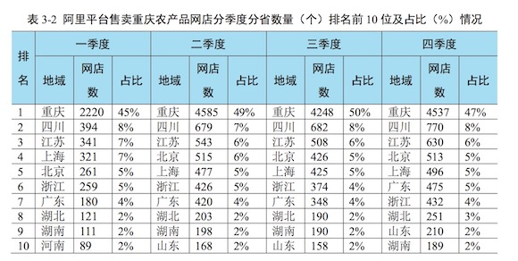 阿里平台售卖重庆农产品网店分季度分省数量(个)排名前 10 位及占比(%)情况。资料来源于重庆农产品电商产业发展研究报告(2016)。
