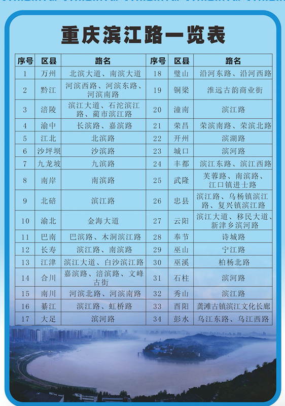 重庆滨江路一览表。重庆市地理信息中心供图 华龙网 发
