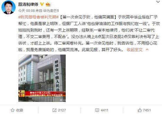 代理律师:于欢已提出上诉
