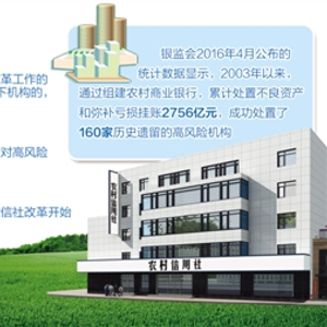 同时,支持并购后的农村信用社转化为农村商业银行。据银监会2016年4月份公布的统计数据显示,2003年以来,通过组建农村商业银行,累计处置不良资产和弥补亏损挂账2756亿元,成功处置了160家历史遗留的高风险机构。