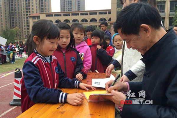 沈石溪老师非常和蔼可亲,大师风范。孩子们向他提了很多问题,如作品中的经历是不是都是真实的等等,沈老师一一予以详细回答。很多孩子请沈老师签名,沈石溪老师都一一满足他们的心愿,签好名,还给他们送上“好好学习”的美好祝愿。
