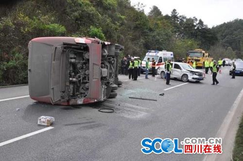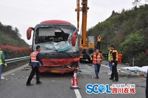 四川在线消息(记者 付真卿)30日晚上11点,四川高速交警发布了下午发生在成自泸高速上一起交通事故的最新情况:2017年3月30日下午14时30分许,一辆车号为川K36735的宇通牌中型运营客车, 在成自泸高速公路仁寿往威远方向行驶,当该车行驶至成自泸高速公路104Km+600m处与一辆车号为川K55D08的吉利牌小型客车发生擦挂,大客车驶向道路右侧与波形护栏相撞,随后大客车侧翻,至大客车上5人当场死亡、8人受伤。