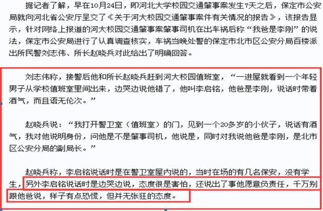 而在2011年3月31日,《河北法制报》在一篇调查报道中也再次给出了案发当晚身处第一现场的几位保安的说法——他们都没听到李启铭以跋扈的口气说出过“我爸是李刚,有本事你们告去”这句话。尤其是后面的那半句“有本事你们告去”,这个说法,这几位现场保安反而是从网上听说的。