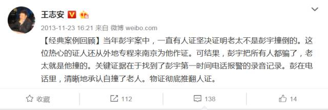 不过,根据央视前著名调查记者王志安2013年提供的信息,以及耿直哥今天与他的再次核实,法庭在一审后,在南京一位法律界人士的建议下,找到了一个被遗忘的重要证据:即案发当天彭宇打110报警时,南京市公安局指挥中心根据他的说法所形成的电话【报警记录】。而在这份电话【报警记录】中,他亲口承认自己撞!了!老!人!只是没有事后在派出所的笔录详细。