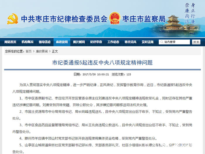 齐鲁网3月31日讯(记者 张洁) 记者从枣庄市纪律检查委员会官方网站获悉,为深入贯彻落实中央八项规定精神,进一步严明纪律,正风肃纪,发挥警示教育作用,近日,枣庄市纪委通报5起违反中央八项规定精神问题。