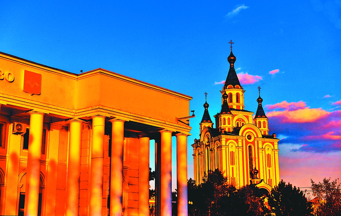 城区的生态环境非常好。沿乌苏里斯克大道走下去,两边分布着许多开放式的街心公园,林木茂密,草坪连片,一些俄罗斯老人坐在长椅上休憩、看书,喂鸽子,怡然自得。沿江修建的景观带呈阶梯状弯延几公里,面向滔滔江流,视野开阔,非常漂亮。城市地标式建筑——著名的东正教堂就耸立在堤岸的最高处,金色的蘑菇顶在阳光下熠熠生辉。这座城市里的历史人文建筑设施也很多,有几家规模很大的博物馆,藏品丰富,历史悠久,值得一看。