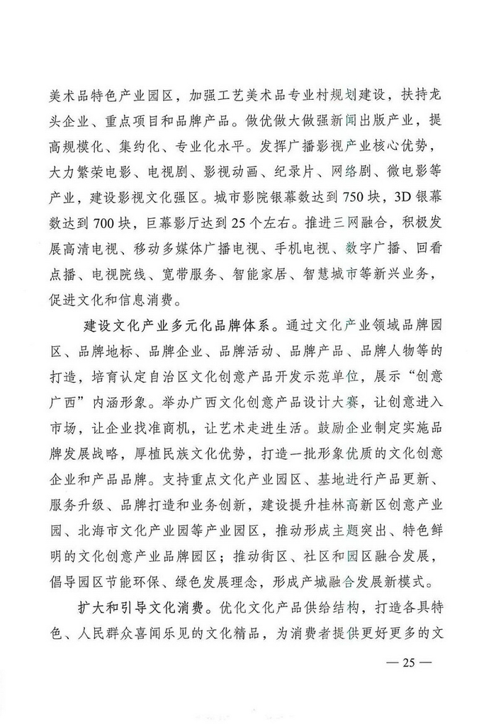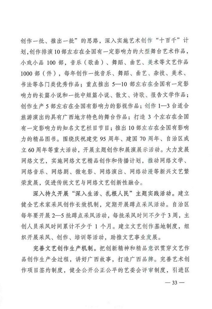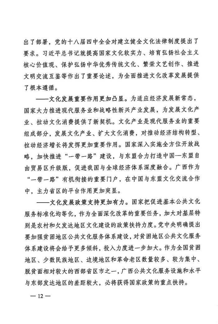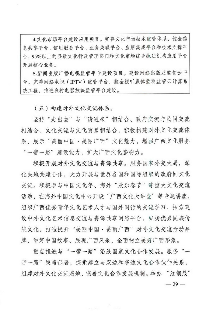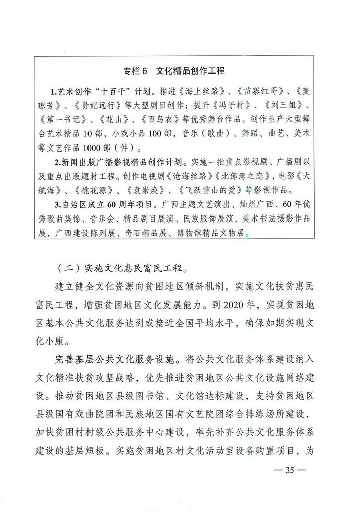 中国经济网北京4月1日讯 广两壮族自治区文化厅网站消息,近日,广两壮族自治区人民政府办公厅通知印发《广西文化发展“十三五”规划》。据中国经济网文化产业频道(微信号:cewenhua)了解,该《规划》总结了“十二五”时期,广西文化建设的成果,规划了“十三五”时期的文化建设目标、任务,在文化设施建设、公共文化服务、文艺精品创作生产、文化遗产保护利用、文化产业发展、文化市场管理、文化交流合作、文化人才培养方面做了规划。>>>更多政策可查看中国经济网“中国文化产业政策库”