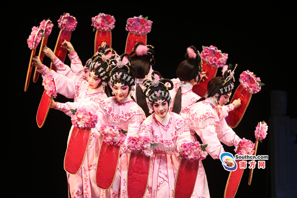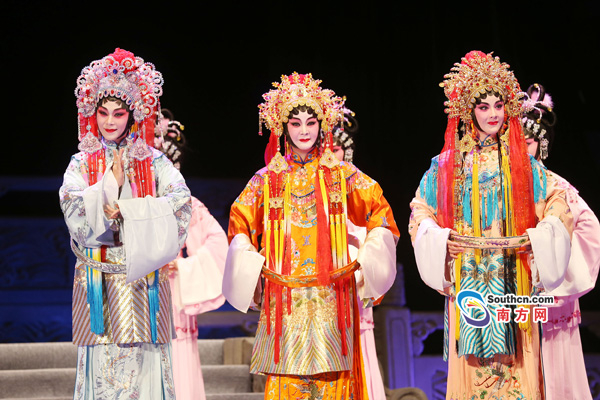 南方网讯(全媒体记者/周豫 摄影/李细华)3月31日晚,由佛山粤剧传习所(佛山粤剧院)组织复排的粤剧传统例戏《香花山大贺寿》在广州中山纪念堂进行重排公演。该剧汇聚了广东省众多粤剧院团的各行当的名家大腕,参演团体有七八个,出场演员达108人,其中国家一级演员22人,中国戏剧“梅花奖”得主15人,阵容鼎盛。