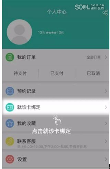 第二步, 注册个人账户,在个人中心里找到“就诊卡绑定”一项。